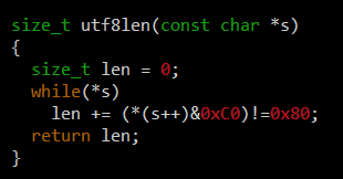printf("%s\nstrlen(): %zu \t utf8len(): %zu\n", list[i], strlen(list[i]), utf8len(list[i]));
